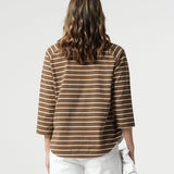 The Unwind Cotton 3/4 Sleeve Tee in Otter and white is crafted from 100% pima cotton jersey in a premium yarn-dyed stripe. With a boat neckline, raglan 3/4 sleeves, curved hem and regular fit, it’s our favourite shape for spring — light, breathable and easy to pair with denim, shorts or skirts.