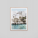 A stunning photographic print of an Italian coastal scene, framed behind glass in a Tasmanian oak frame.