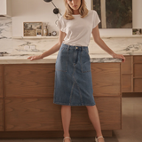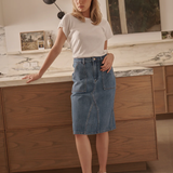 Get summer-ready in our denim Bridget Skirt, designed with a mid-rise waist, repurposed jean details, and handy patch pockets. It’s made from a soft cotton blend with just the right amount of stretch for ultimate comfort. Embrace style and ease with this summer staple.
