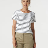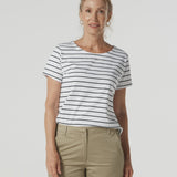 The Relax Cotton Tee in Sage is crafted from 100% pima cotton jersey in a premium yarn-dyed stripe for softness and breathability. The perfect basic tee reimagined in modern colours, it features a boat neckline with contrast facing, a curved hem and contrast hem detail, making it an easy go-to with denim, shorts or skirts.
