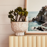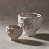 Introducing the Daphne Pot, an artisan-crafted piece that seamlessly blends classical form with organic elegance. Crafted from ceramic, this pot features a unique leaf-looking texture, with protruding elements that add a tactile and visually intriguing dimension. The creamy tones of the Daphne Pot enhance its classical aesthetic while maintaining an organic allure. Handcrafted with meticulous attention to detail, the Daphne Pot exhibits a more classical form, evoking a timeless sophistication. The organic, leaf-inspired texture introduces a touch of nature to the piece, creating a harmonious fusion of classical and natural elements. Versatile in its application, the Daphne Pot serves as a distinctive vessel for your plants