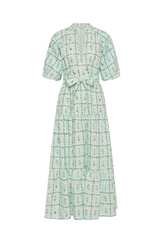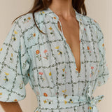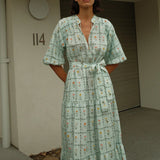 The Dutton Dress in our exclusive Calypso Tile print is crafted in a Premium Linen. The Dutton Dress is designed as a relaxed midi dress silhouette. Featuring blouson puff sleeves, a V-neckline and a tiered skirt. The Dutton Dress is designed to hang loosely from the body, and has matching sash belt to bring in the waist.