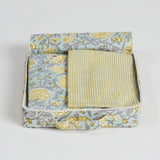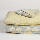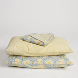 The Flower Market Doona Set comes in a beautiful box and matching fabric bag, perfect for storage. Featuring a muted sky blue, lilac and mustard floral print with mustard, sky blue and white stripe design on the reverse. Available in Queen and King, this set comes with a duvet cover and four matching pillowcases ~ two matching one side of the cover and two to match the reverse.