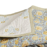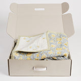 The Flower Market Quilt comes in a beautiful box and matching fabric bag, perfect for storage. Featuring a muted sky blue, lilac and mustard floral print with mustard, sky blue and white stripe design on the reverse. Available in Queen and King.
