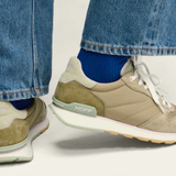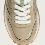 Retro-style sneakers combining different materials and colors. Embroidered logo detail on the back. Closure with laces.