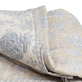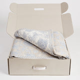 The Lakehouse Quilt comes in a beautiful box and matching fabric bag, perfect for storage. Featuring a muted blue floral print on a reversible sand dollar grey and white base. Available in Queen and King.