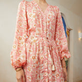Featuring a v-neckline and centre front button closure, this dress exudes sophistication and elegance. The gathered sleeves with elastic cuffs and dropped waistline add a touch of femininity to the overall silhouette, while the midi length provides a timeless and versatile look. Made with shell buttons, this dress is both stylish and sustainable. Elevate your style with the Larissa Long Sleeve Midi Dress.