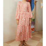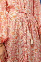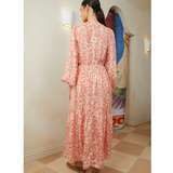 Conjuring wanderlust and exotic cities of afar, the Larissa Dress is crafted from sumptuous hand block printed silk habotai in a soft peach pink hue. Beautifully cut with a V neck and gathered tiered skirt, its billowing silhouette makes for an elegant wardrobe addition. Pair with a woven cross body bag and leather slides on your next summer escape.