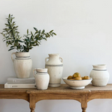 The Lisbon collection is a primitive style ceramic made from terracotta. Each piece has a chalky white finish adorned with imperfect black line detailing that makes each piece unique.
