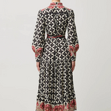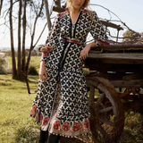 Crafted from a premium blend of linen and viscose, this maxi dress combines the breathability of linen with the smooth drape of viscose, ensuring comfort and effortless style. The placement print design features intricate geometric patterns and floral motifs, celebrating a tapestry of artistic details. The contrast paneling and tiered maxi silhouette add depth and dimension, making this dress a statement piece for every occasion.