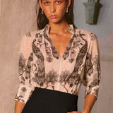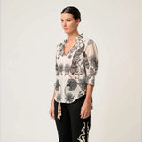 The shirred high collar with soft ruffles adds a romantic touch, while the gathered shoulders and 3/4 sleeves bring volume and balance to the silhouette. A V-neckline offers a flattering contrast, creating a harmonious blend of structure and fluidity.