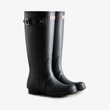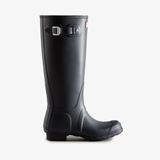 Perfect for wet weather conditions, this women's Wellington Boot has been at the heart of the Hunter Original brand since its introduction in 1956. Formed of natural rubber, each pair is made from 28 hand-cut parts and assembled over three days on an aluminium last bespoke to Hunter, before being vulcanised for superior protection. Featuring the Hunter Original tread pattern, and a comfortable polyester lining, these tall black welly boots are a rainy-day necessity.