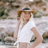 The Montecristi hat company provides the original panama hats, crafted from natural palm fibre by hand in Ecuador. These hats are handwoven and hand-blocked according to traditional local craft by skilled artisans. They are lightweight and breathe, so are the perfect hat to wear in the hot Australian summer. The Fedora has a slight variation in brim size between 7 cm - 8 cm.