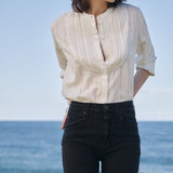 Tuxedo style blouse in classic white with a silver thread stripe . A perfect all occasions blouse.