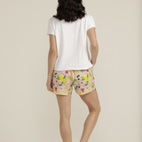 A fun 100% linen in lemon print fabric is used in these cute elasticised and drawstring waisted shorts. Pockets have also been included.