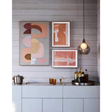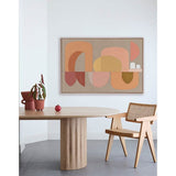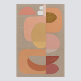 An experimentation of a strong blush of colour, the warm geometric shapes are consecutive and sometimes overlapping creating a rhythm and flow of energy. The darker colours appear to be shadows and can change with a trick of the eye to a solid arcing shape. Framed in a raw oak shadow box frame.