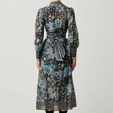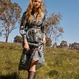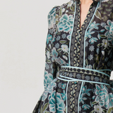 Bring elegance and comfort together with the Sienna Trim Cotton Silk Midi Dress in Dahlia Fields. This stunning dress features a captivating floral print in shades of teal, cream, and sage green, set against a rich, dark background. Perfect for making a statement while staying effortlessly chic. It features a lightly tailored in waistline, button down front, removable waist tie and an additional slip dress underneath for coverage.
