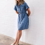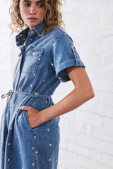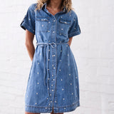 The Simone Dress is the easy mini shirtdress with a cool twist. Featuring patch utility pockets, buttons all down the front and an embroidered heart detail this is one-and-done kind of style that can be paired with sneakers for a cool, casual vibe.