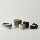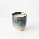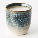 The post petite of the Tia candles. Experience the essence of fig with our candle, nestled in a ceramic pot adorned with a teal and brown glaze, featuring a charming pattern from rim to base. Each candle comes with a dust cover.