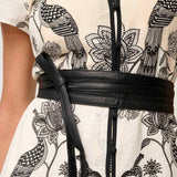The intricately printed florals and regal birds cascade effortlessly down the A-line silhouette, drawing the eye and adding artisanal flair. Thoughtfully designed with a V-neckline, soft cap sleeves, and a contrasting waistband tie, the Xanthia dress flatters the figure while remaining comfortable and breathable.