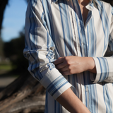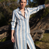 The Finn Shirt Dress in our exclusive Antique Stripe features a wide stitched curved hem with a cinched waistline. Our dress showcases a signature ASTON branding placard on the yoke.