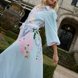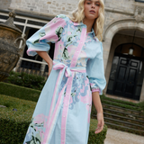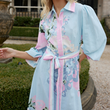 This flowing shirt dress embodies effortless sophistication, with billowing sleeves, a cinched belted waist, and adorned with our exclusive placement print. The soft, delicate tones and airy silhouette create a harmonious balance of relaxed elegance and refined style, perfect for serene seaside strolls or elevated casual occasions.