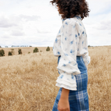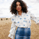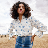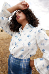 This delicate floral blouse brings a touch of romance to any look. Crafted from lightweight fabric, it features a soft white base adorned with charming blue floral prints. The structured collar and button-down front add classic sophistication, while the voluminous sleeves with layered cuffs create a statement finish.