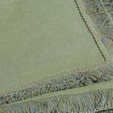 The tablecloth features beautifully detailed contrasting blue and sage fringed edging.