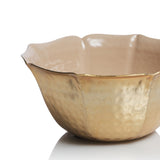 The Bazaar Lotus bowl comes painted in a two-tone mushroom and warm gold and features a beautifully ornate, floral-inspired scalloped edge with a tangible, hammered finish.