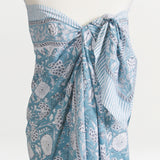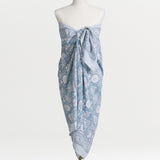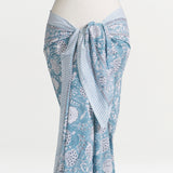 The Cambria Sarong boasts an all-over hand-block printed, floral design in tones of sky and navy blue highlighted with white, finished with a blue and white striped edge.
