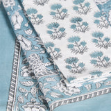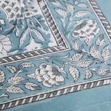 The Cambria Tablecloth features a striking floral hand-block printed pattern with a matching border, finished with a simple stitched edge.