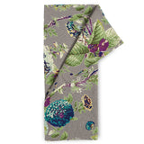 The Chiswick Collection features a striking hand-block printed floral design in greens, teals, purples and blues on an ash grey base.