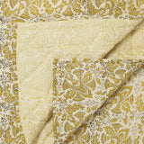 The Clovelly Golden Quilt has an eye-catching floral design in mustard, highlighted in umber brown on a natural cotton base, with a more subtle contrasting design on the reverse.