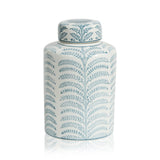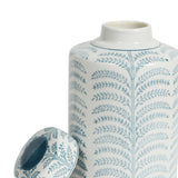 The Ferne Jar is finished in a duck egg blue and off-white painted fern pattern on a ceramic base.