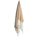 The lightweight Folk Throw has a continuous horizontal design with a mustard panel that's edged by soft black and white pinstripes on a white linen base, finished with knotted tassels.