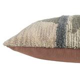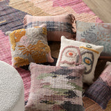 The Juniper Field Cushion Cover comes in an eye-catching abstract pattern in pink, purple, off-white and mustard.