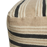 The Kingsley Ottoman is made from jute and features an all-over striped design in tones of natural, biscuit and charcoal.