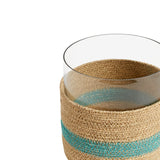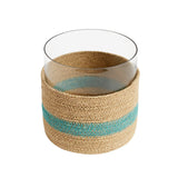 The Kudu Candleholder Medium is made of a glass jar to house your candle, with a jute surround boasting a large aqua stripe.