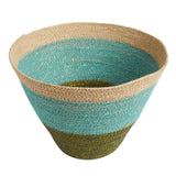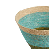 Made from a striking jute weave and intricately made, the Kudu Collection celebrates organic shapes with bands of aqua and khaki.