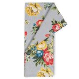 The Portobello Collection features a colourful floral hand-block printed design in tones of fuchsia, butter, forest green and vibrant blue on a soft blue mist base.