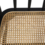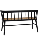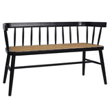 The Selby Bench Seat in Black is a functional and refined design, featuring a spindled backrest and finished in black with a contrasting, natural woven rattan seat.