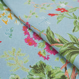 The Somerset Collection features a vibrant floral hand-block printed design in colourful tones of fuchsia, crimson, ochre and greens on a French blue base.