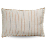 The Tarlow Chestnut Cushion Cover features a repeated striped pattern in rust and grey on a natural linen base, finished with a fringe detail.