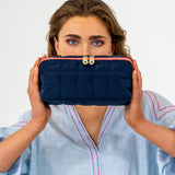 The Elms+King Washbag opens to reveal a spacious interior and two elasticated pockets. Lined with a bright pop of nylon, you will never lose track of your favourite items. Made from premium quilted nylon with 14-karat light gold-plated hardware the Washbag will keep all your beauty essentials in good order.