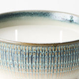 The post petite of the Tia candles. Experience the essence of fig with our candle, nestled in a ceramic pot adorned with a teal and brown glaze, featuring a charming pattern from rim to base. Each candle comes with a dust cover.