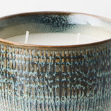 The post petite of the Tia candles. Experience the essence of fig with our candle, nestled in a ceramic pot adorned with a teal and brown glaze, featuring a charming pattern from rim to base. Each candle comes with a dust cover.