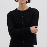 The Ladies Wool Cardigan in Black is a refined and versatile wardrobe staple, crafted from 100% Australian Merino wool for supreme softness, warmth, and breathability. Designed with an intricate diamond cable pattern, this wool cardigan enhances a classic button-up silhouette, offering sophisticated texture and timeless elegance.