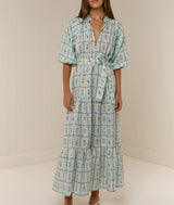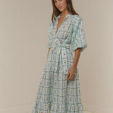 The Dutton Dress in our exclusive Calypso Tile print is crafted in a Premium Linen. The Dutton Dress is designed as a relaxed midi dress silhouette. Featuring blouson puff sleeves, a V-neckline and a tiered skirt. The Dutton Dress is designed to hang loosely from the body, and has matching sash belt to bring in the waist.