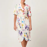 The exclusive Plume Blossom print bursts with vibrant florals, bringing a fresh, romantic energy to your wardrobe. Intricate lace trims and spliced paneling highlight the craftsmanship, while the subtle high neckline and soft blouson sleeves lend a refined romantic touch. A self-tie belt cinches the waist for a flattering fit, while the curved hemline with front split adds a modern edge and ease of movement.