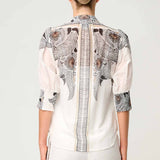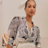 The exclusive Ivory Casablanca print takes centre stage, featuring intricate motifs that exude quiet luxury. Designed with a curved collar, button-down front, and delicate pleating at the shoulders, the Leila Shirt strikes the perfect balance between classic tailoring and contemporary flair.